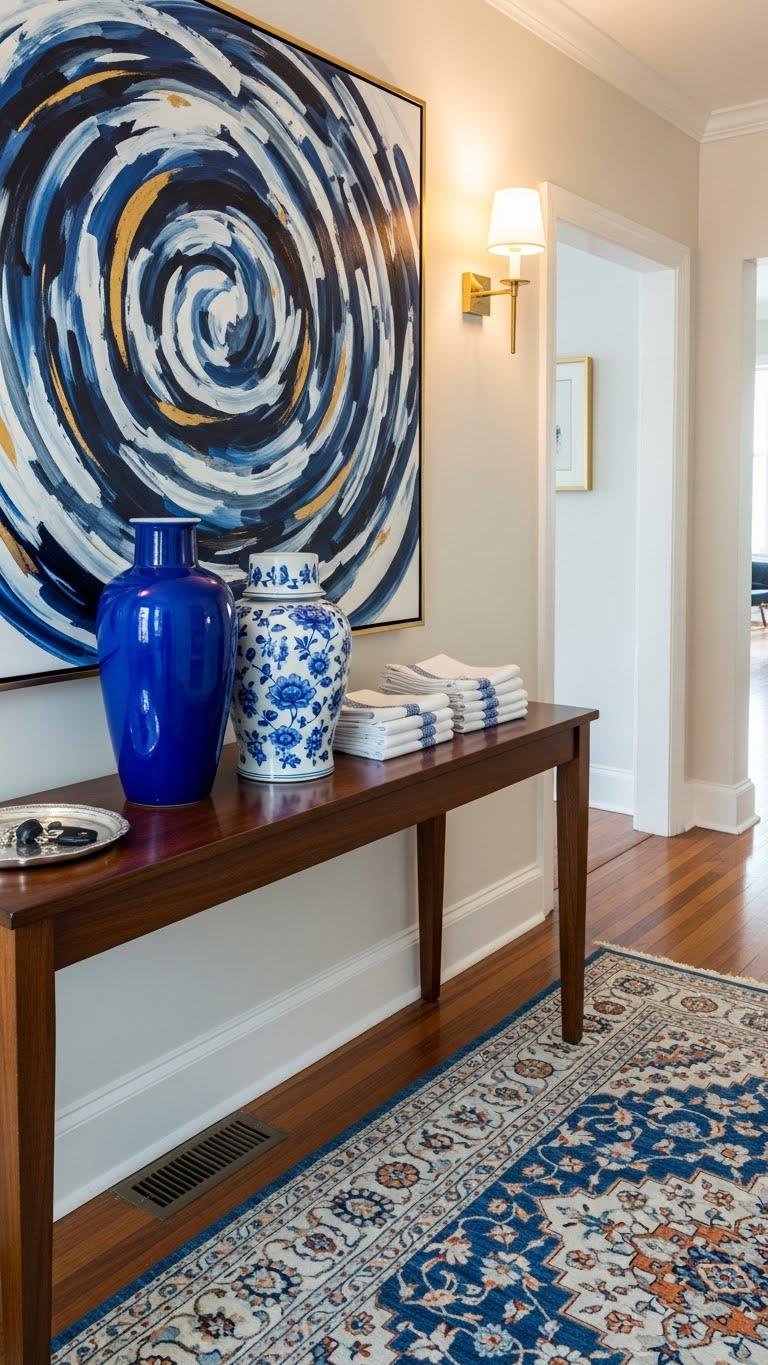 Pairing oversized blue-and-white vases with botanical or landscape artwork in vibrant greens gives your entryway an immediate sense of life and movement—where the ceramics provide sculptural weight, the art supplies color and context.