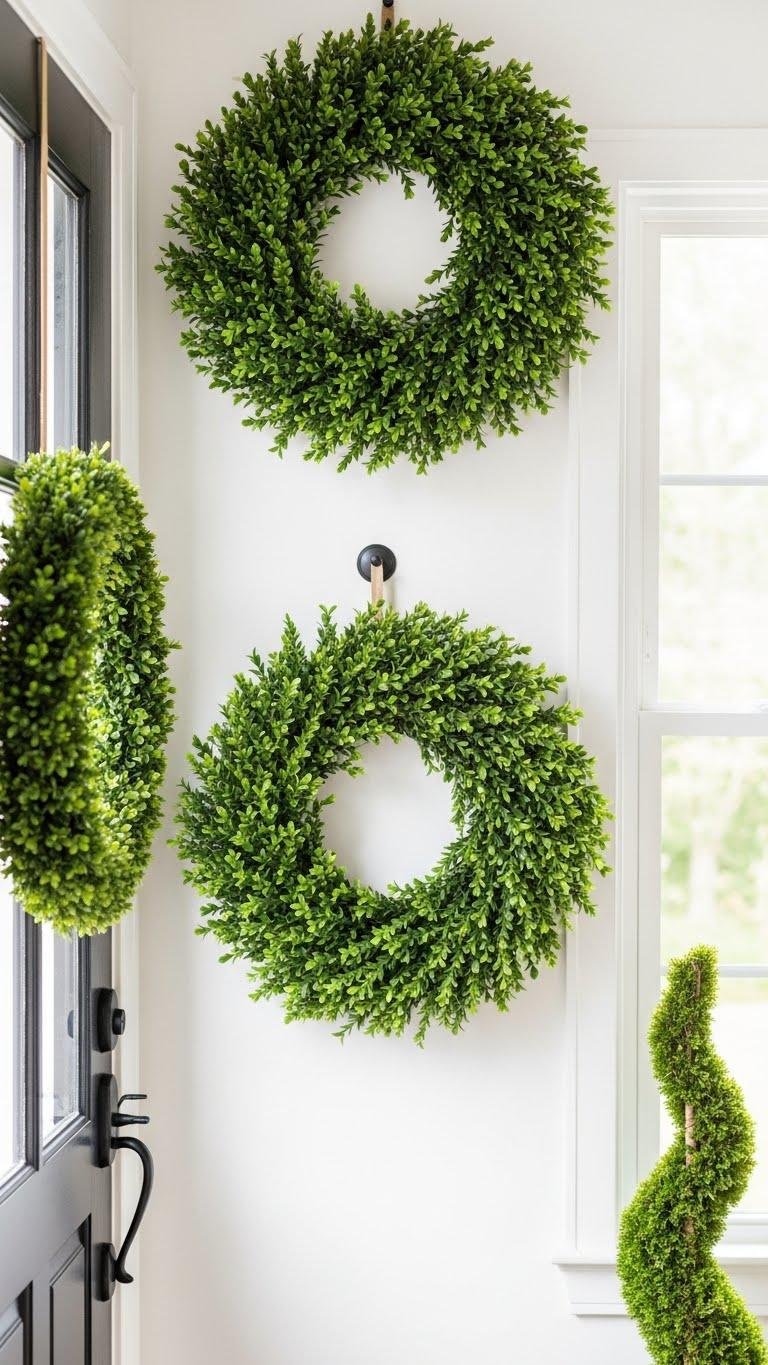 You’ll create an airy, modern focal point that reads as effortless. Pair a slim boxwood garland loop with a moss topiary accent for texture contrast. Hang it slightly above eye level to draw the gaze upward and amplify a sense of open, independent style.