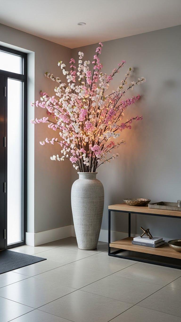 Elevate your entryway with a tall vase filled with faux cherry blossom stems to add instant height, softness, and seasonal charm without the upkeep of real blooms. You’ll choose vase placement to balance scale and traffic, pair stems with subtle blossom lighting for evening warmth, and keep the arrangement airy and modern.