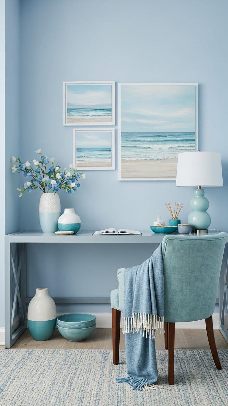 You can carry the calm of a guest-office corner into the rest of room by layering in soft blues—think powder, sky, or muted teal—so the space feels airy and restorative.