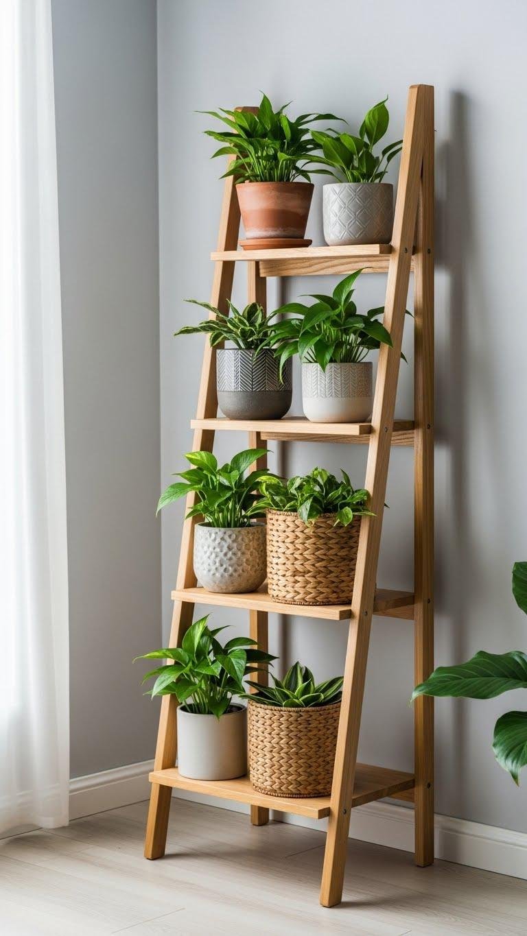 Bring vertical greenery into your space with a freestanding plant ladder that layers pots and trailing vines without touching the walls.