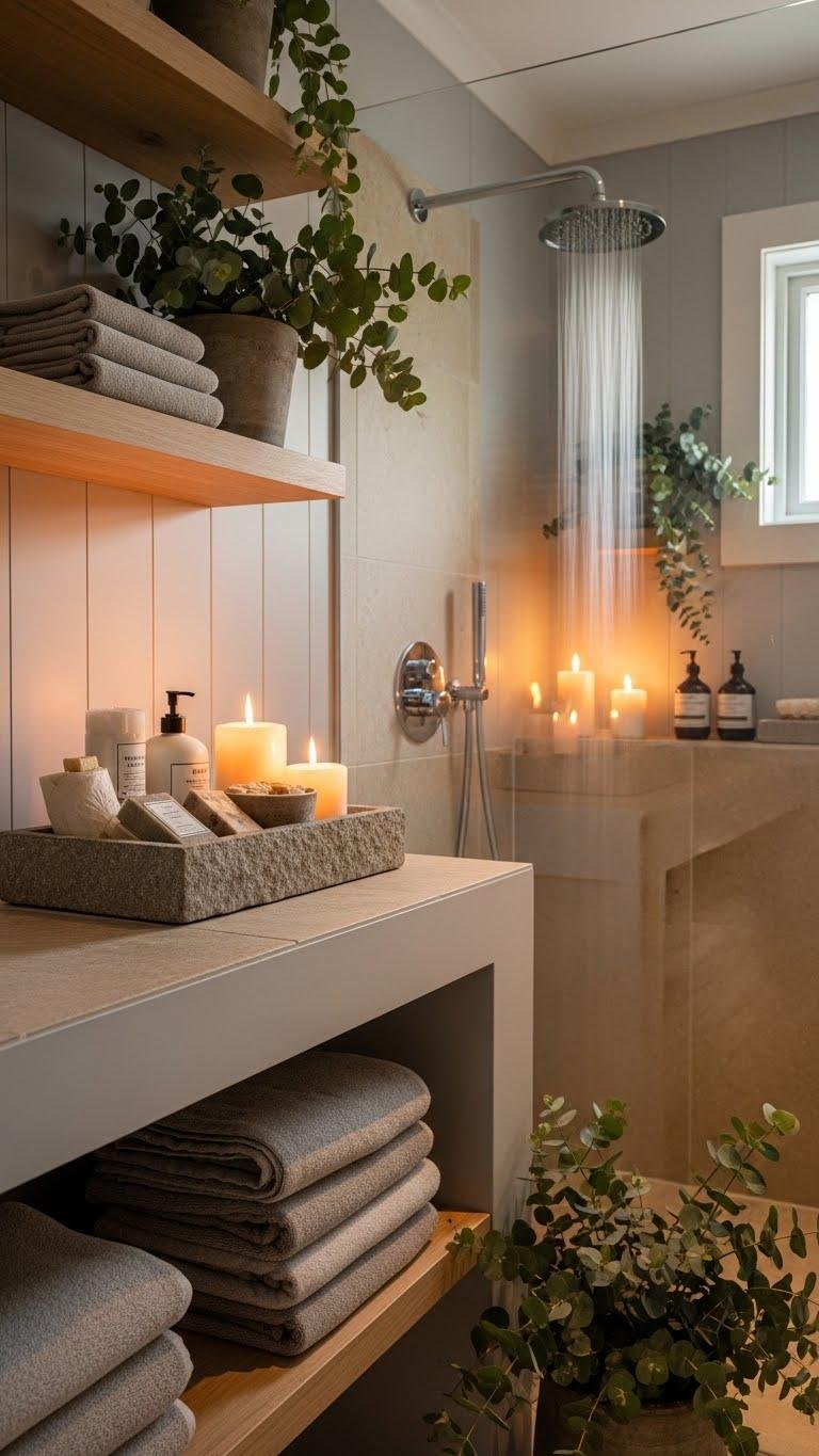 After freshening seating areas with herbal scents, carry that crisp, calming energy into your bathroom to create a spa-like retreat. Swap clutter for open shelving, layer soft linen towels, and add a natural stone tray for soaps and candles.