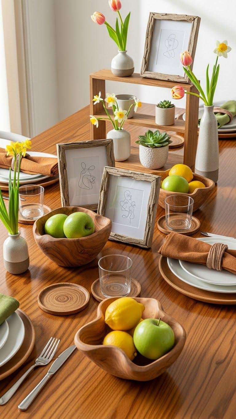 Bring in small wooden accents to add instant warmth and tactile contrast to your spring scheme. Swap plastic for sculpted bowls, driftwood frames, and minimalist shelving. Rub surfaces with beeswax polish to deepen tone and protect grain. Scatter woodgrain coasters on tables, pair with linen napkins, and keep pieces pared-back so each natural texture feels intentional, free, and effortlessly modern.