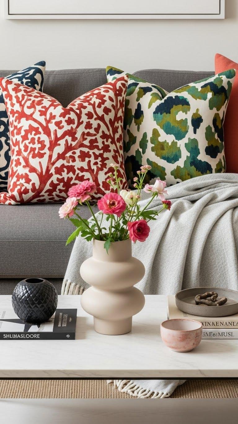 Pick pillows with a mini floral motif or subtle geometric scales in soft pastels and natural textures. Mix solids and prints, keep color ties, and let the arrangement feel effortless and free.