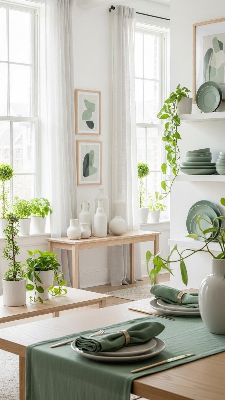 Swap a bold art frame for muted tones, layer green textiles like runner or napkins, and keep surfaces uncluttered. You’ll free the space, feel calm, and let light lead the mood.