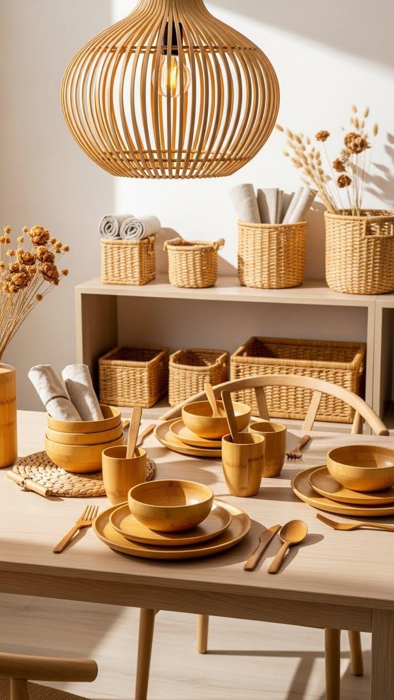A handful of bamboo accents can instantly refresh your spring decor with natural texture and sustainable style. You’ll love mixing Bamboo tableware for casual, earthy meals and wicker baskets for open shelving. Swap heavy fixtures for airy Bamboo lighting to cast warm, movable shadows.