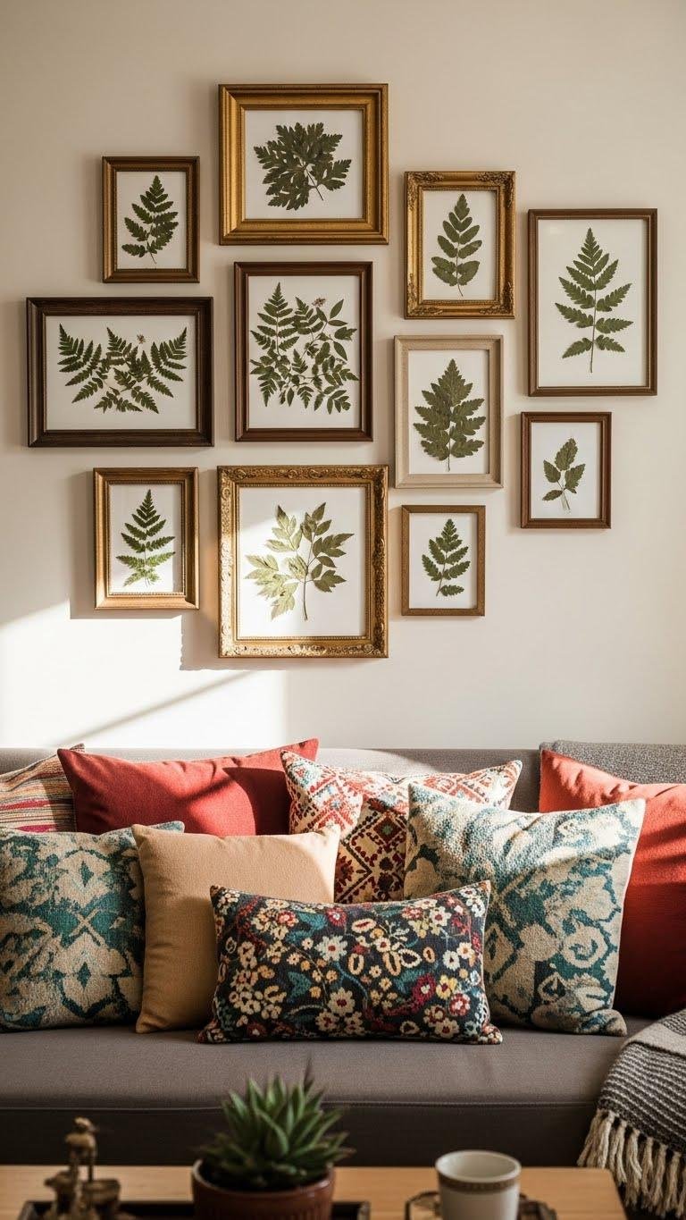 If your seating pops with colorful pillows, let the walls answer back with a botanical gallery that balances that energy. You’ll curate pressed botanicals in mismatched vintage frames, mix small studies with larger specimens, and embrace tasteful frame restoration for character.