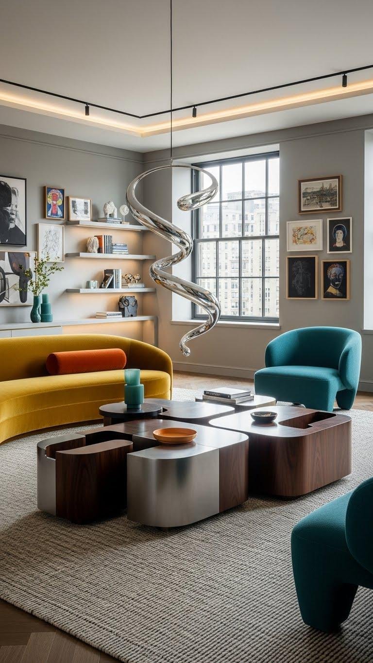 Anchor your seating area with a sculptural coffee table that reads like art—its curves, negative space, or unexpected materials will set the tone for the whole room.