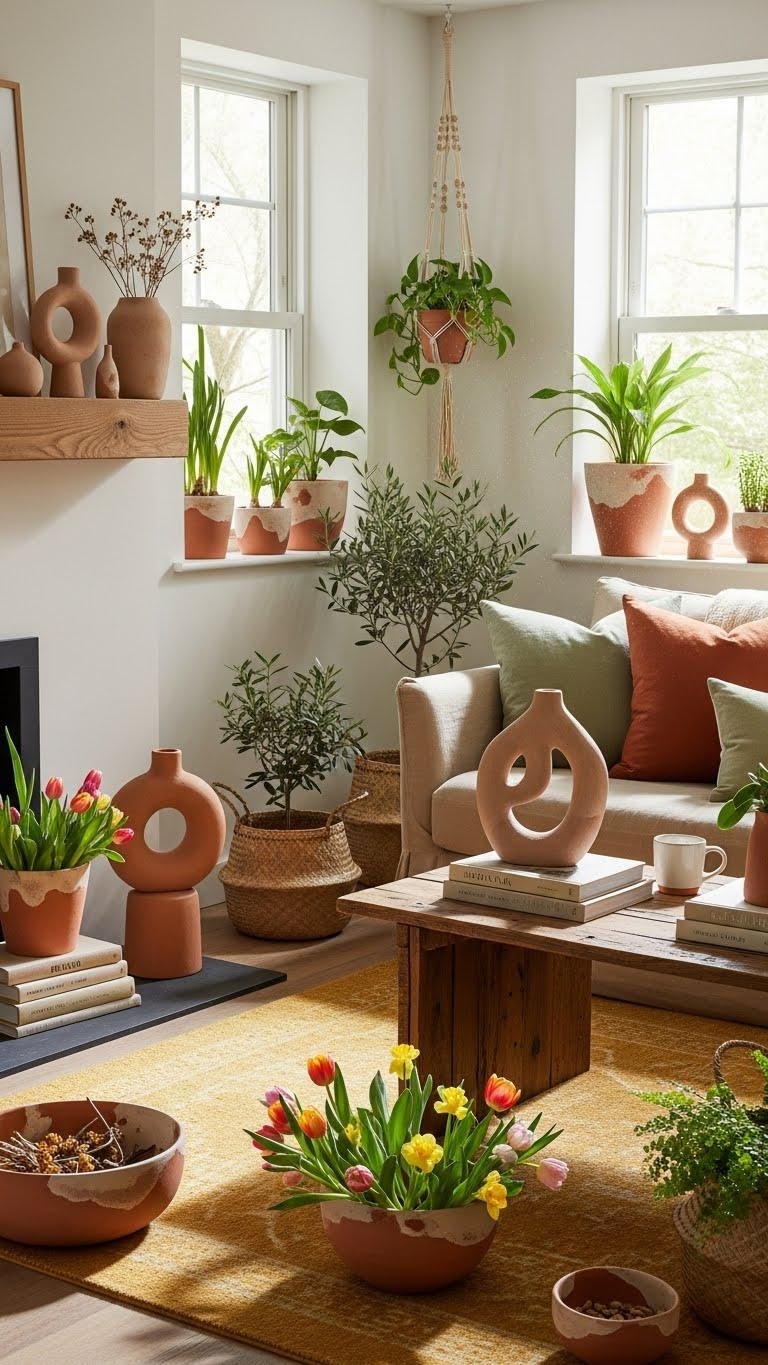 Bring terracotta accents into your living room to warm the palette and add grounded, tactile contrast to lighter spring tones.