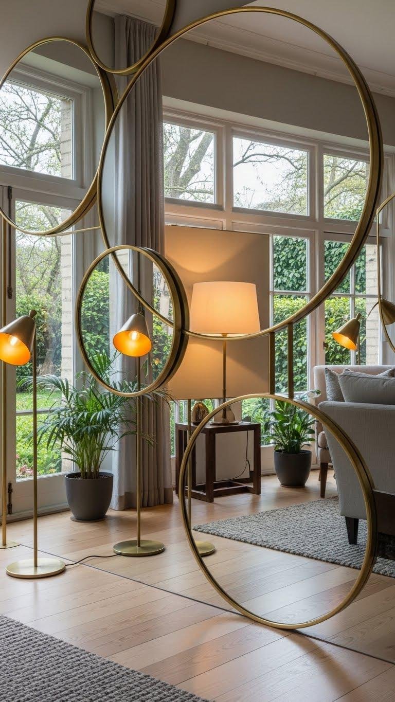 Because light and movement make a room feel alive, hang circular mirrors to amplify both—position them to catch morning sun, reflect garden views, or bounce lamp glow into darker corners. You’ll choose round brass frames for warmth and sculptural grace, arranging several for layered reflections that deepen space.
