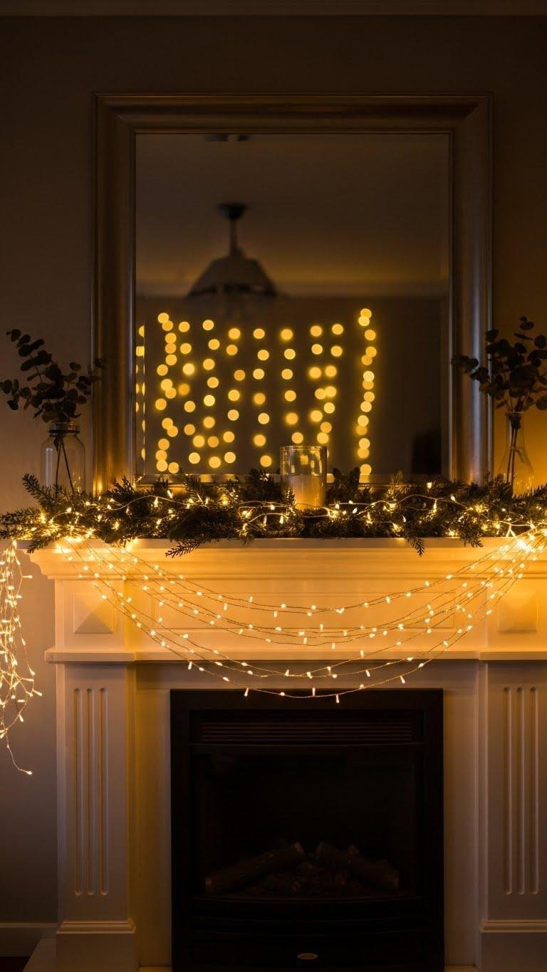 Often the simplest additions make the biggest impact: drape warm-white fairy lights across your mantel and around mirrors to add instant sparkle and a soft, layered glow.