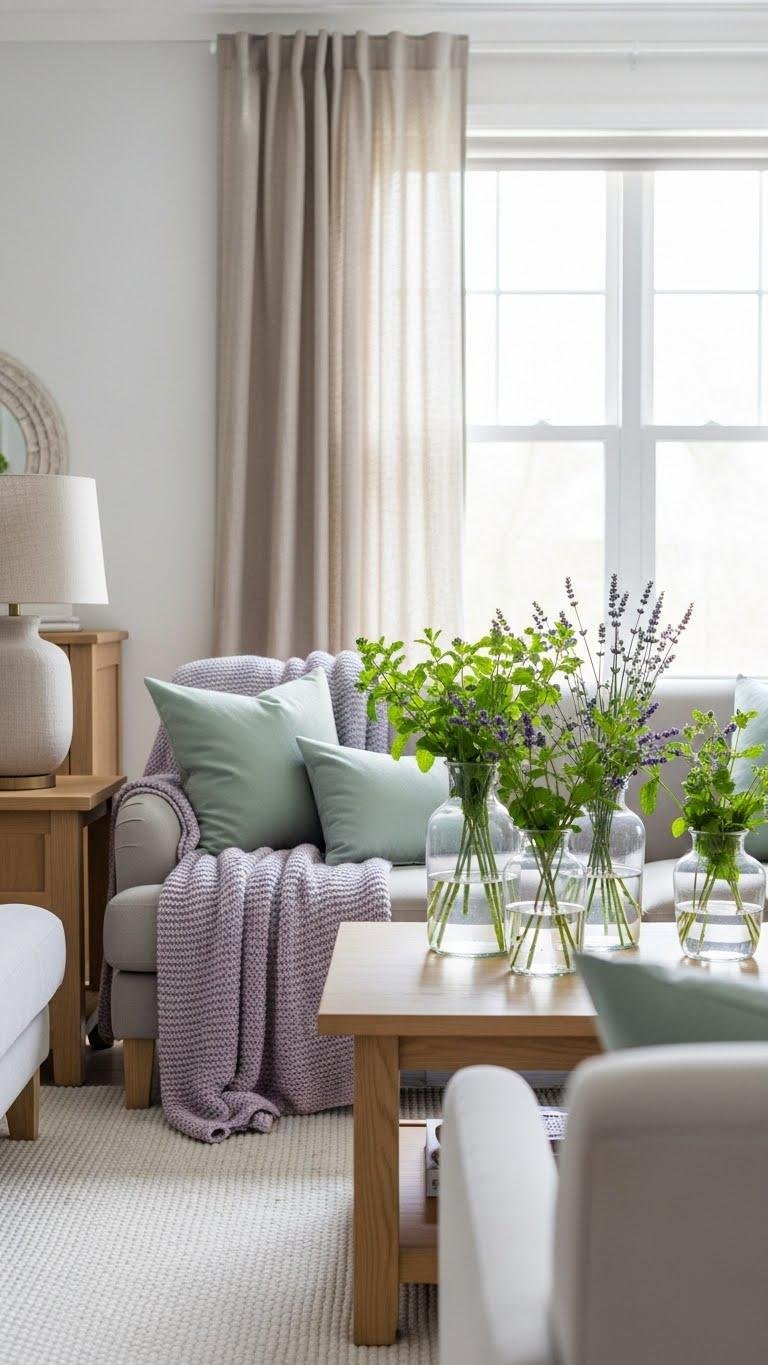 When you swap in mint and lavender accents, the room instantly feels fresher and more intentional—think soft sage pillows, pale lavender throws, and glass vases filled with sprigs that bring both color and calm.