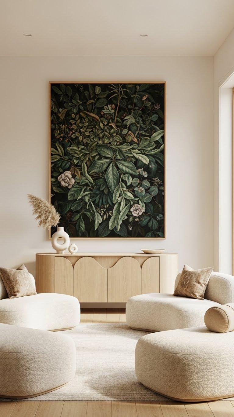 That oversized botanical piece sets a bold anchor, so soften the room by mixing in curved, sculptural furniture that echoes those organic forms.