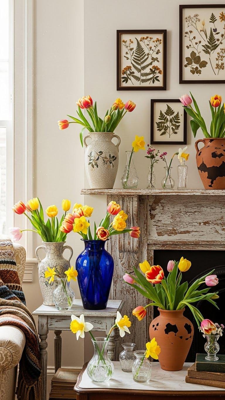 You’ll mix abundant tulips or daffodils with delicate antique budvases for focused accents, or press and frame pressed flower arrangements nearby.