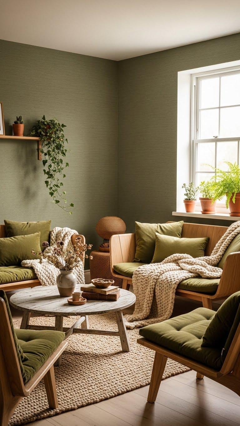 Bring the cottagecore warmth into the rest of your living room by introducing moss green accents that ground the space with an earthy calm. You’ll layer subtle moss green wallpaper on an accent wall, pair sculptural wood furniture with velvet moss cushions, and add woven throws. The look feels liberated, serene, and curated—effortless elegance that invites you to breathe and roam.
