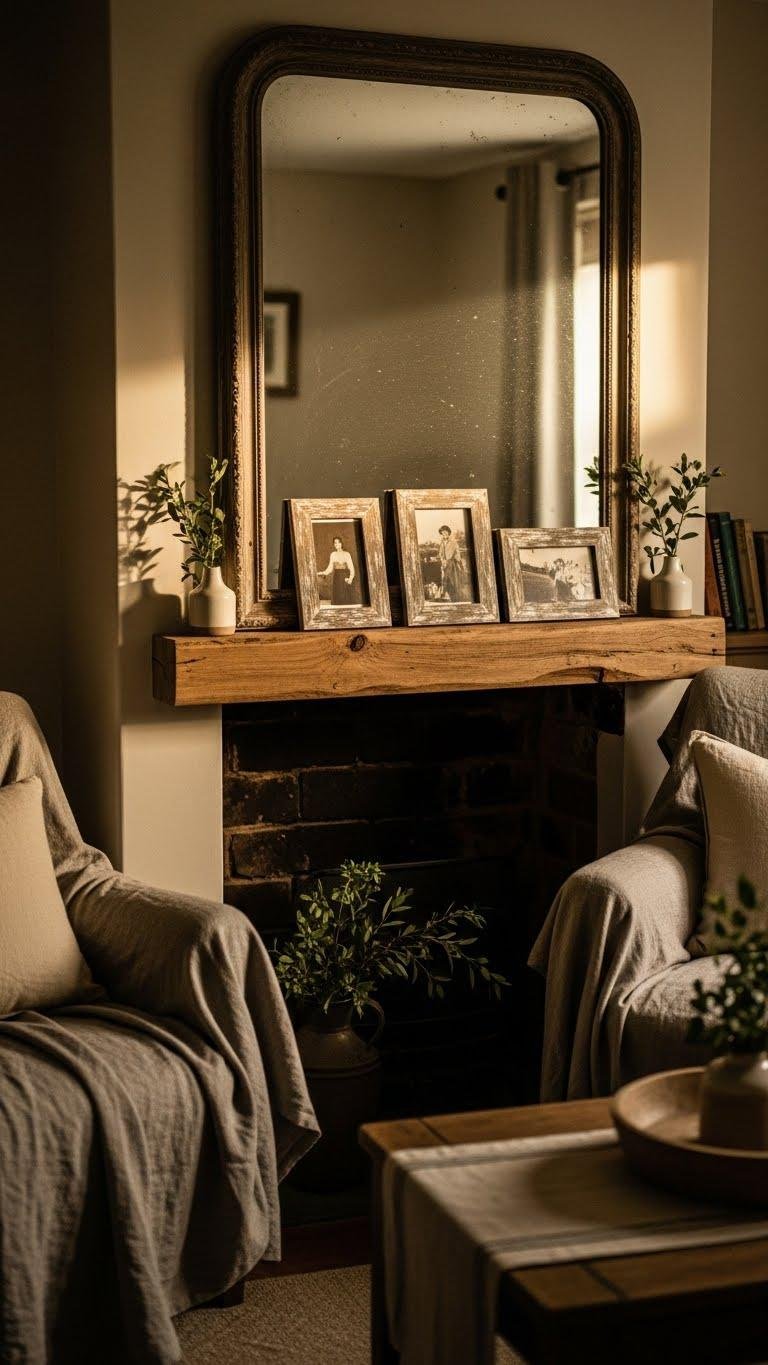 Hang an antique mirror to instantly amplify sunlight and deepen the room’s cottagecore warmth. You’ll love strategic antique placement above mantels or opposite windows, creating mood and visual space.
