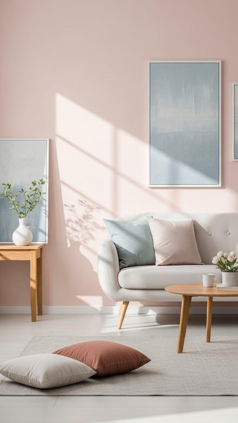 Swap out heavy drapes for sheer pastel curtains to instantly lighten the room and let soft, diffused light play across your living space. Choose linen sheers in airy hues and hang them on slim pastel rods to create a breezy, liberated vibe. You’ll maintain privacy while embracing transparency, letting colors and form breathe so your living room feels open, calm, and invigoratingly modern.