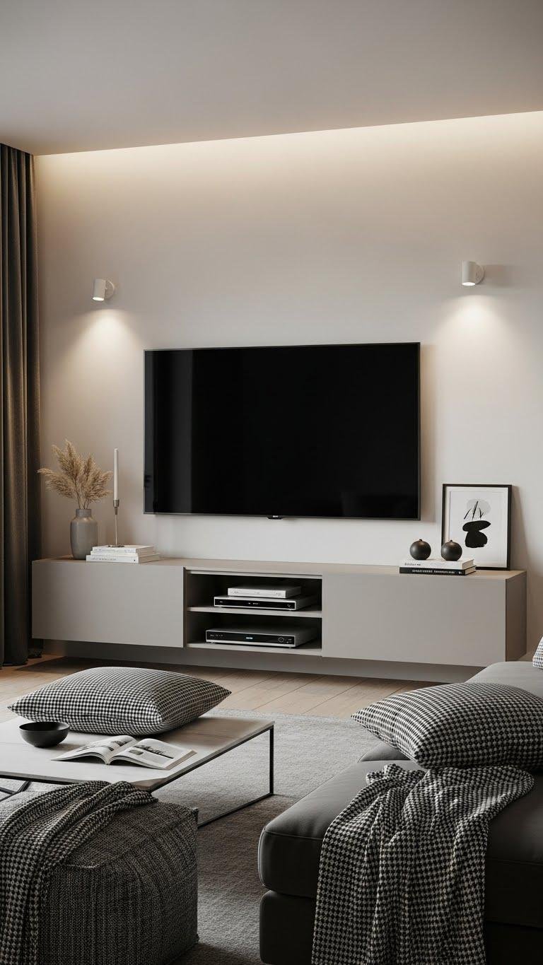 You’ll want a TV stand that’s calm, functional, and quietly stylish—low profile, tidy surfaces, and a few tactile accents to keep things from feeling flat. Think floating units, slim storage, and curated trios like a ceramic bowl, stacked neutral books, and a small sculptural piece, with hidden cable management and subtle backlighting to soften the screen glow. Here’s how to make it feel edited and effortless—start with these ideas.