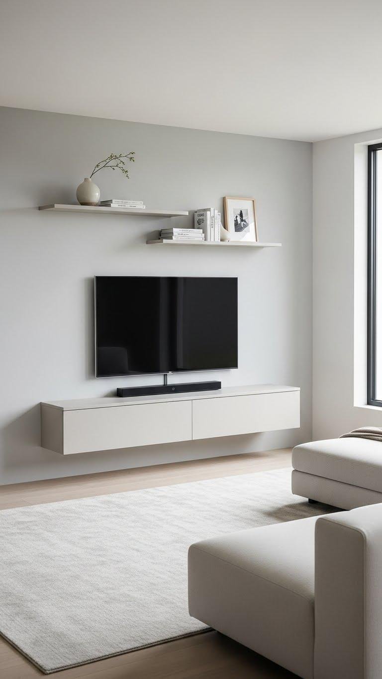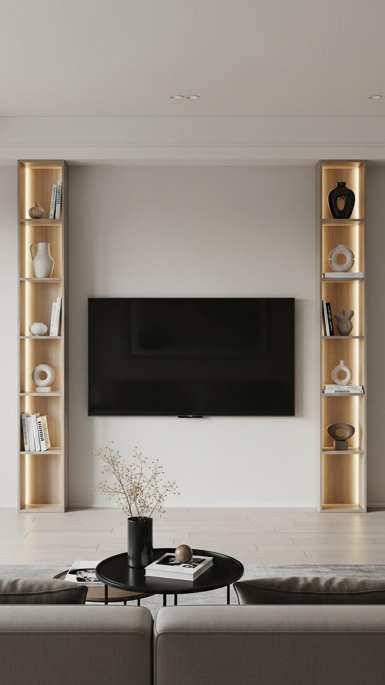 If you’ve created breathing room on the TV stand with low stacks and a single ceramic vessel, extend that calm upward with slim vertical shelving on either side of the screen.