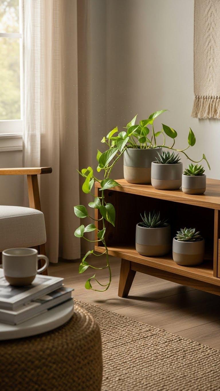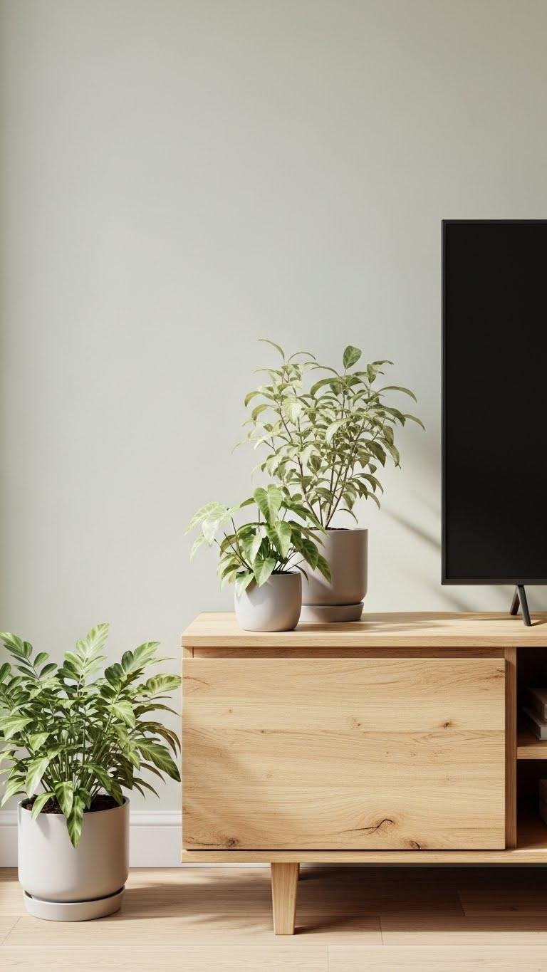 Often a few small planters and a single trailing vine are all you need to soften a TV stand and introduce living texture. You’ll place mini succulents in matte pots for restrained points of interest, then let a trailing pothos spill over an edge, its lightness suggesting movement.