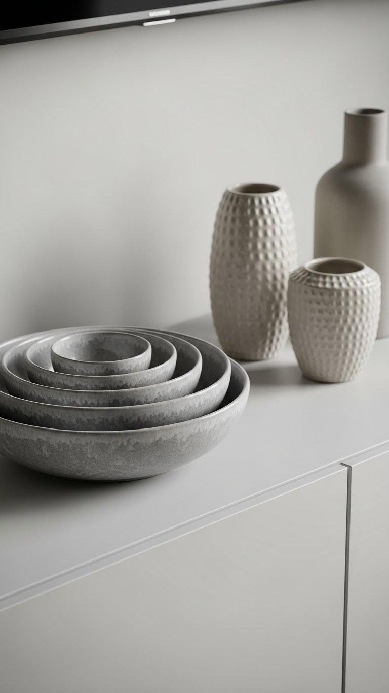 You’ll balance stacked volumes with one or two glazed vases, keeping color muted and shapes spare.