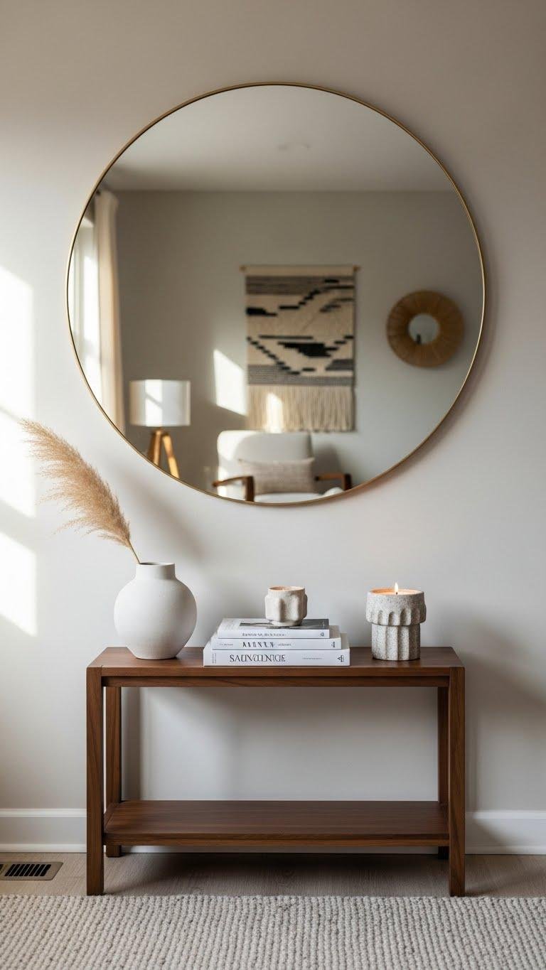 After you’ve added a small living vignette, balance that tactile focus by hanging a mirror above the stand to visually widen the room. Choose an oversized round or a slim antique mirror to reflect light and movement, creating airy depth.