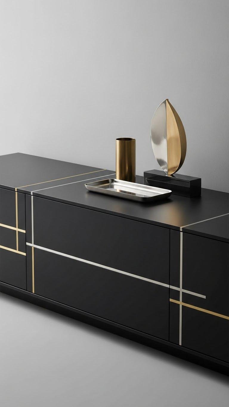 You’ll pair matte black hardware with subtle metallic inlay accents on drawers or trim, choosing sparse objects that echo brass or nickel.