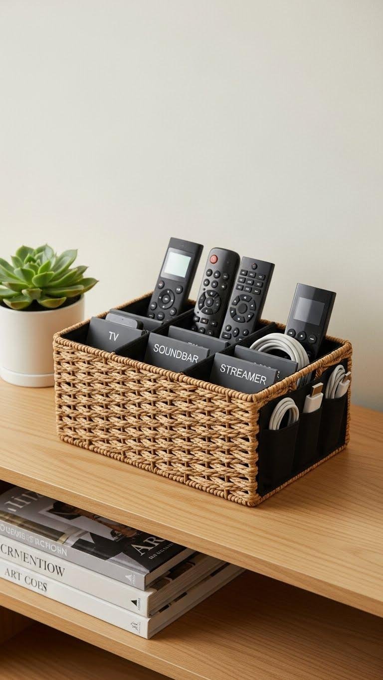 Use slim remote caddies inside, simple basket labels for quick identification, and discreet charger pockets for cords. The result: a minimal, intentional display that frees your space and your mind.