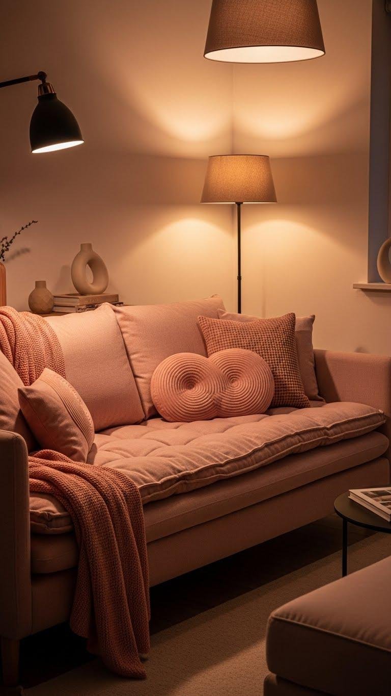 Start by anchoring the room with a soft blush sofa — it instantly lifts the vibe without shouting. You’ll layer blush textiles in varied textures, pair sculpted cushions, and keep lines clean. Add soft lighting to create warmth and freedom to lounge, choosing dimmers or shaded lamps. You’ll keep accessories minimal, letting that sofa be the bold, liberated statement piece.