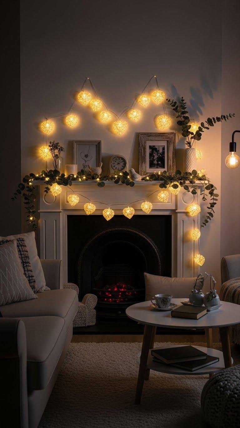 When you drape heart-shaped string lights over the mantel, they instantly turn a simple shelf into a playful focal point that feels both romantic and modern.
