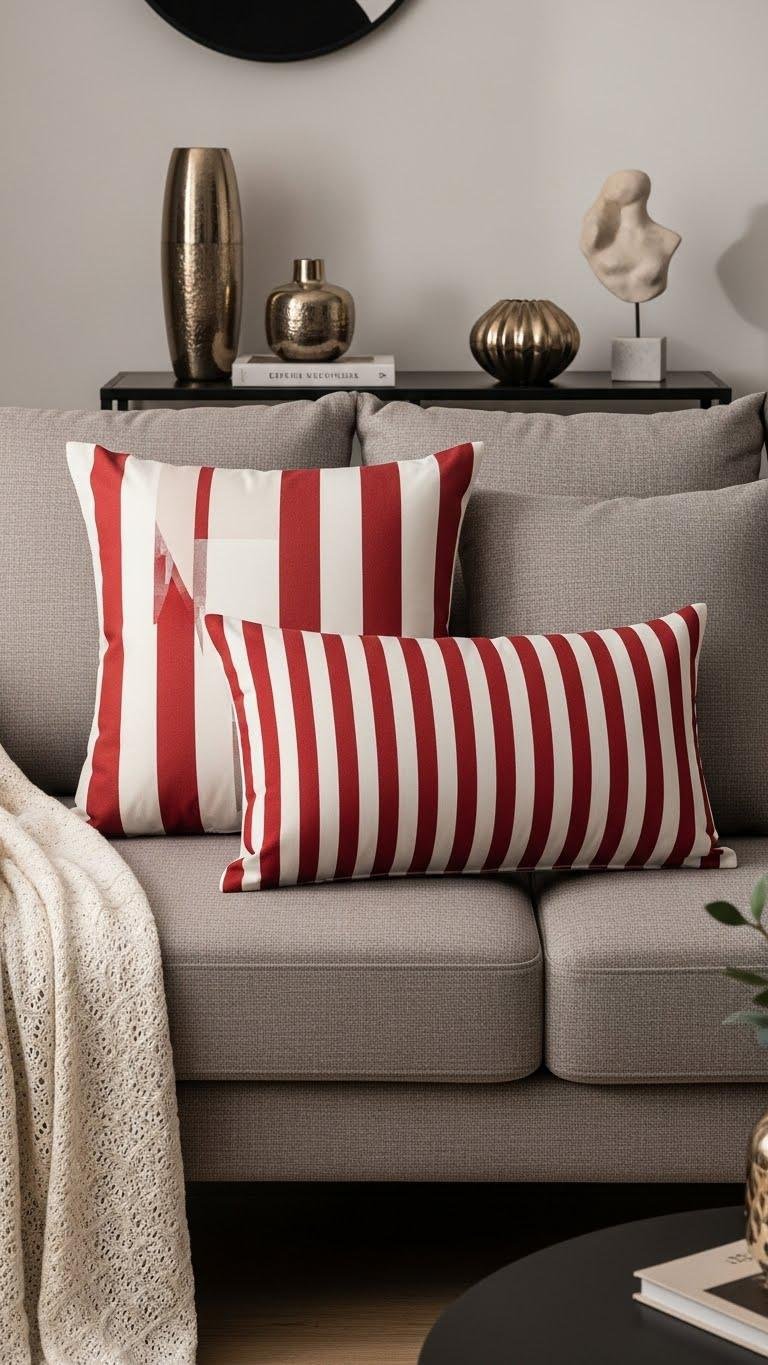 Pair two red-and-white striped pillows on your sofa or armchair to introduce instant graphic energy—place one square and one lumbar to balance scale and movement.