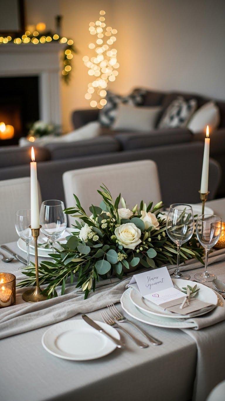You’ll layer a simple greenery centerpiece along a neutral cloth runner, add a few taper candles, and leave breathing room.