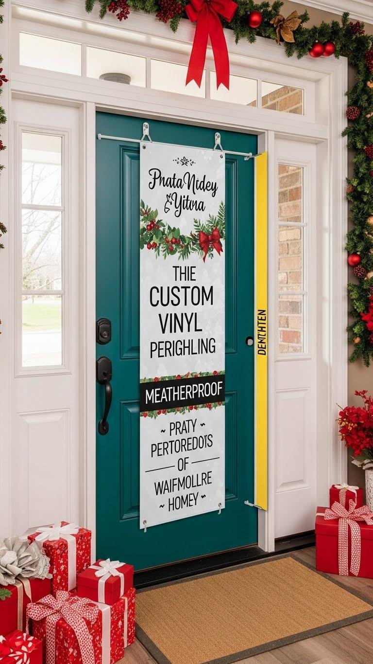 Hang a custom vinyl banner above your doorway to make a bold, on-theme statement the moment guests arrive. Choose lightweight, weatherproof seasonal material in matte or satin finish for easy styling.