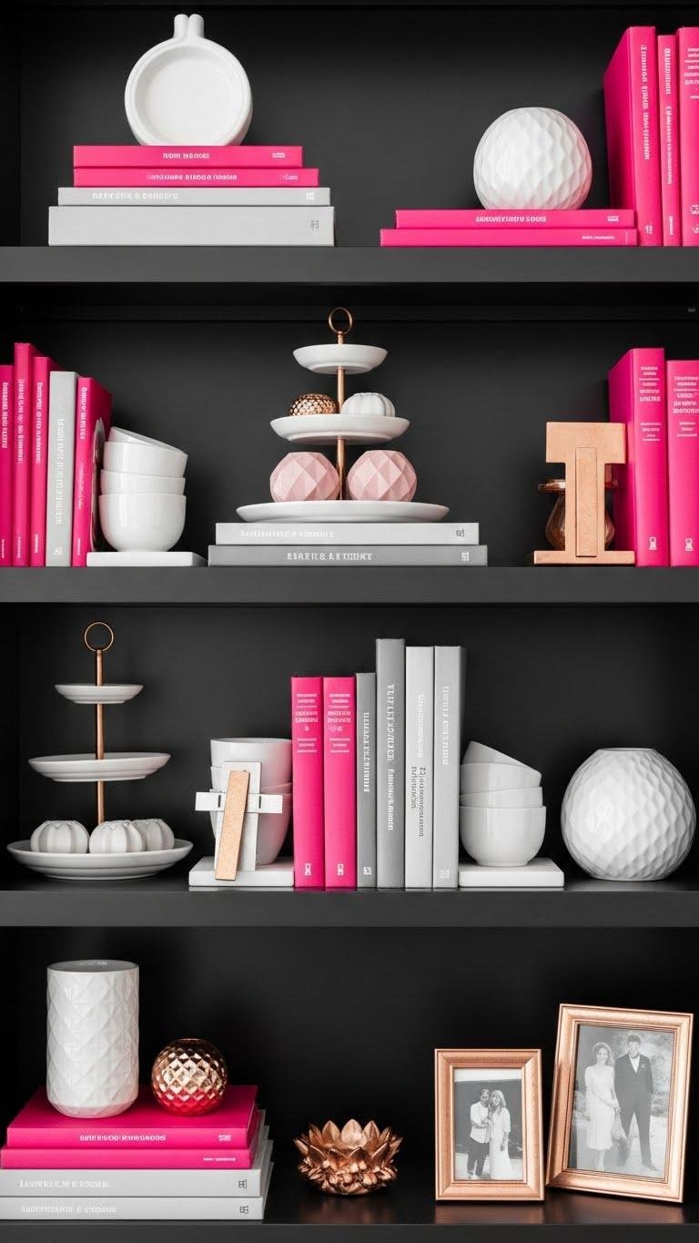 Layer pink and rose-gold pieces with intention to make your bookcase feel curated, not cluttered. You’ll mix vintage hardcover volumes with monochrome spines, group objects using tiered styling, and tuck metallic bookmarks into display copies.
