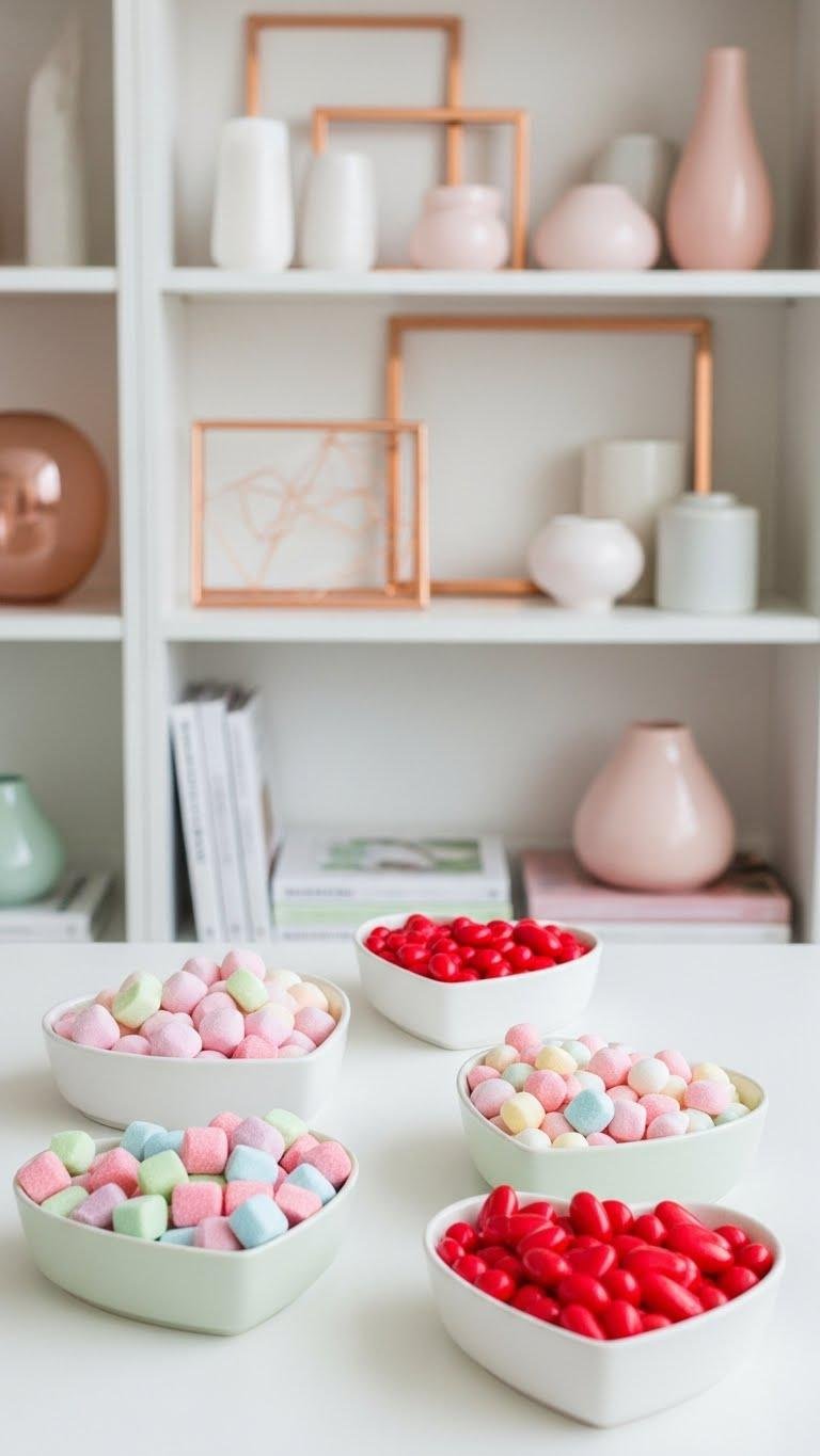 You’ll lean into ceramic hearts and rustic bowls, mixing pastel valentine sweets with bold reds. Arrange with purpose: a minimalist candy arrangement, selective colors, and easy-access treats that feel celebratory and free.