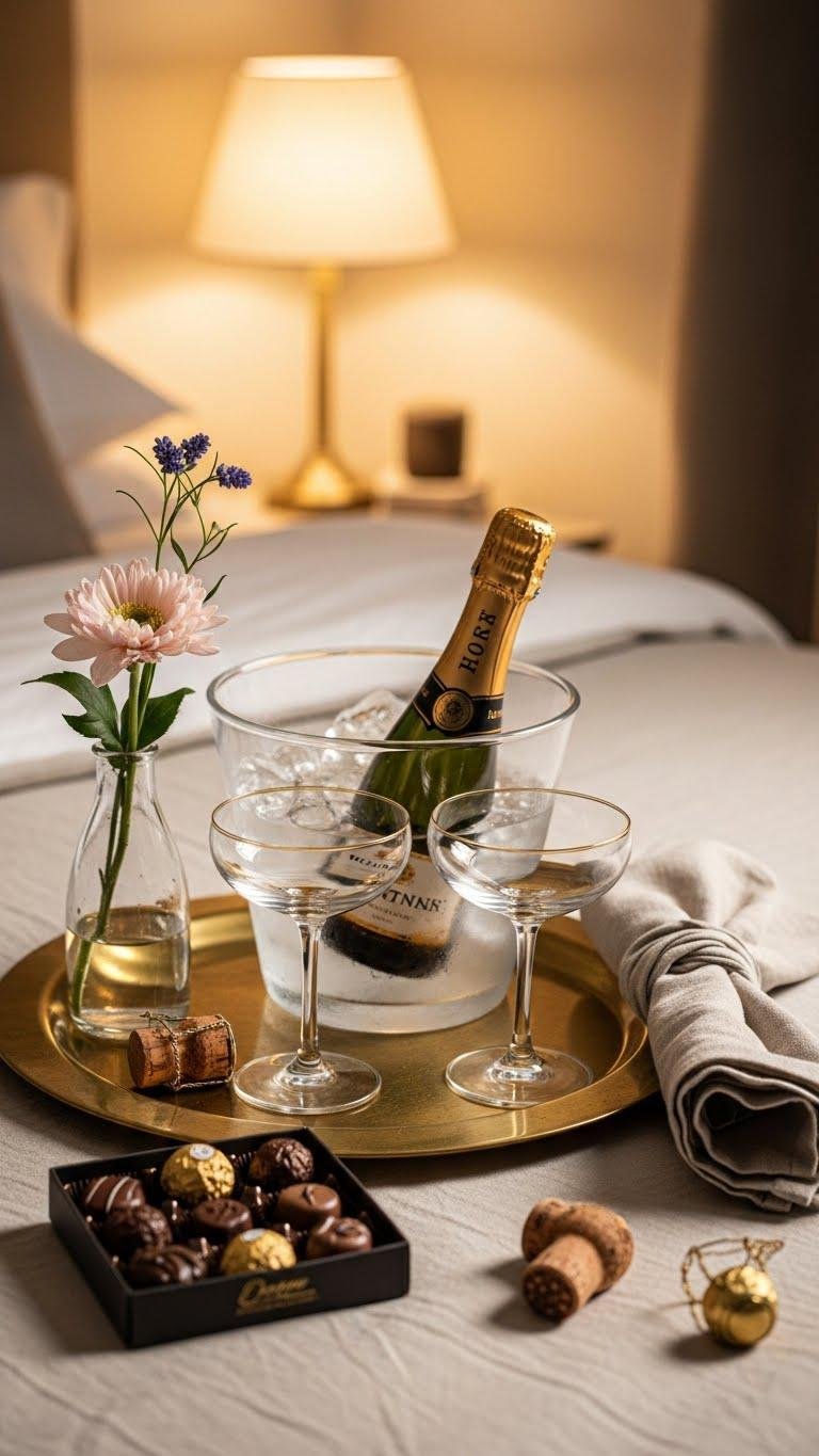 While soft lighting sets the mood, a champagne-and-chocolate bedside vignette gives your bedroom an immediate, luxe Valentine’s touch; pair a chilled mini bottle and two coupe glasses with a small box of assorted truffles on a brass tray, add a single stem in a bud vase, and tuck a linen napkin beneath to keep the arrangement intentional and spill-proof. You’ll scatter a few champagne corks nearby, invite chocolate truffles for savoring, and leave space to relax, celebrate, and reclaim your night.