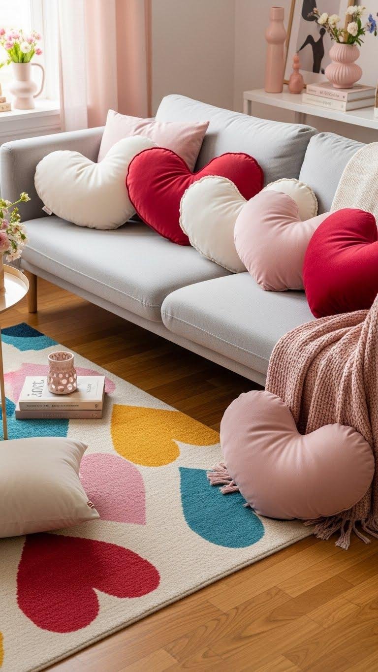When you pair plush heart-shaped cushions with a themed rug, you instantly give the room a playful, intentional beat—cushions add tactile romance while the rug grounds the look and unifies color and pattern. Mix a cotton heart pillow with velvet or linen hearts, echoing vintage tufting on a low-pile rug. You’ll create effortless, liberated charm that feels curated and joyful.