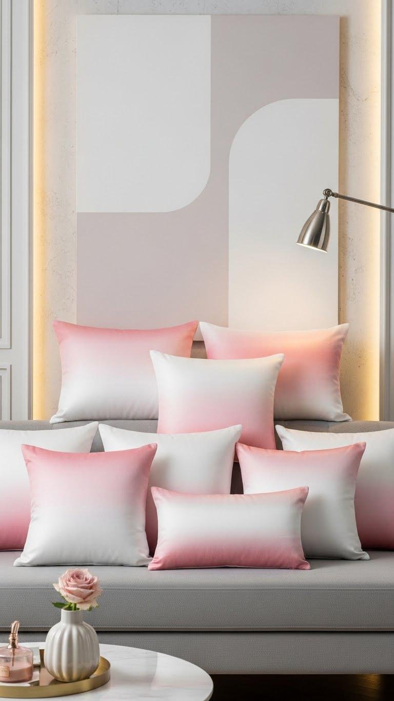 After you’ve set that champagne-and-chocolate bedside vignette, bring the same luxe feeling to your sofa with layered pink and white throw pillows. Mix ombre pillows with solid pastels, alternate matte linen and glossy satin textures, and vary sizes for effortless depth.