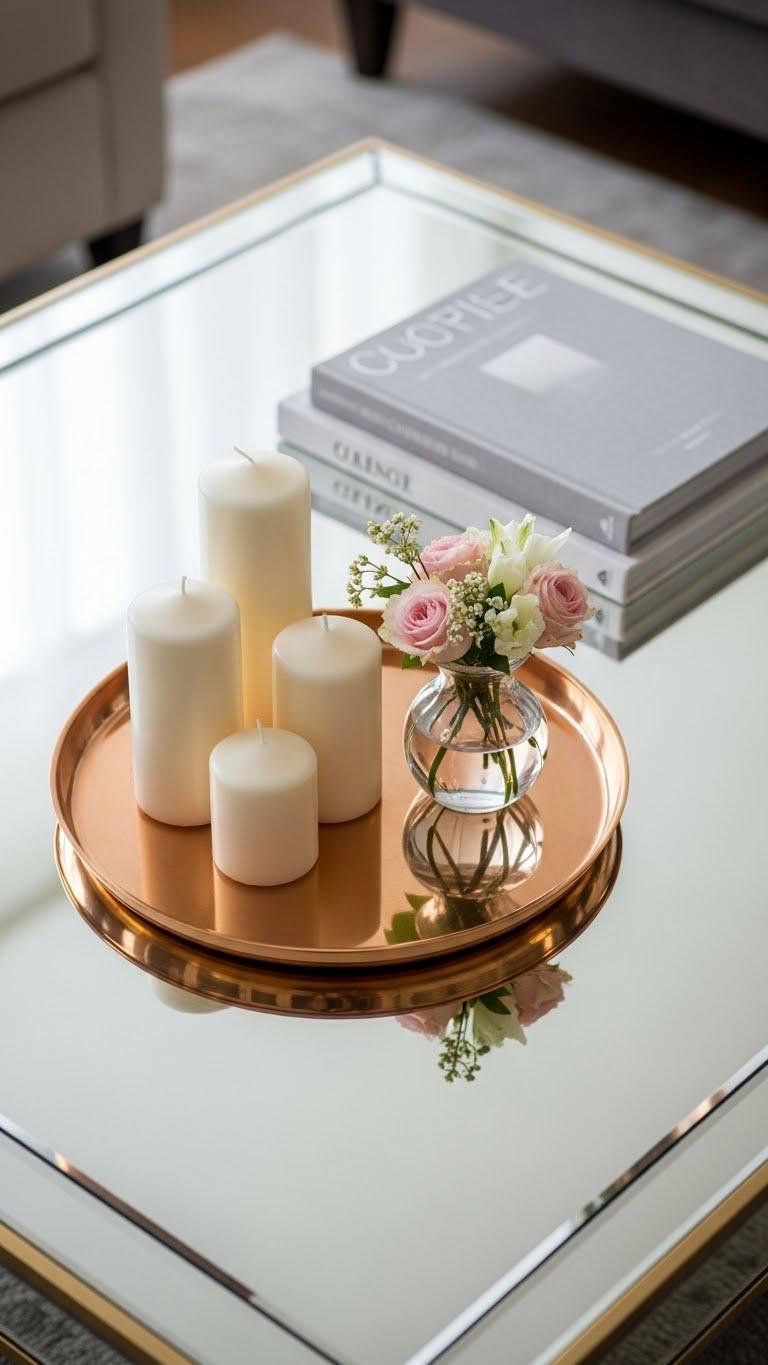 You’ll love how a metallic tray with a mirrored surface reflects light, amplifying scented candles and blooms. Keep the arrangement a minimalist vignette so your space feels open, intentional, and effortlessly free.