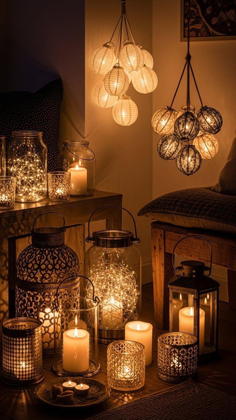 Often you’ll find that a small corner transforms into the room’s most intimate spot when you layer twinkling lanterns—string lights tucked into glass, paper, or metal lanterns create warm pools of light that invite lingering.
