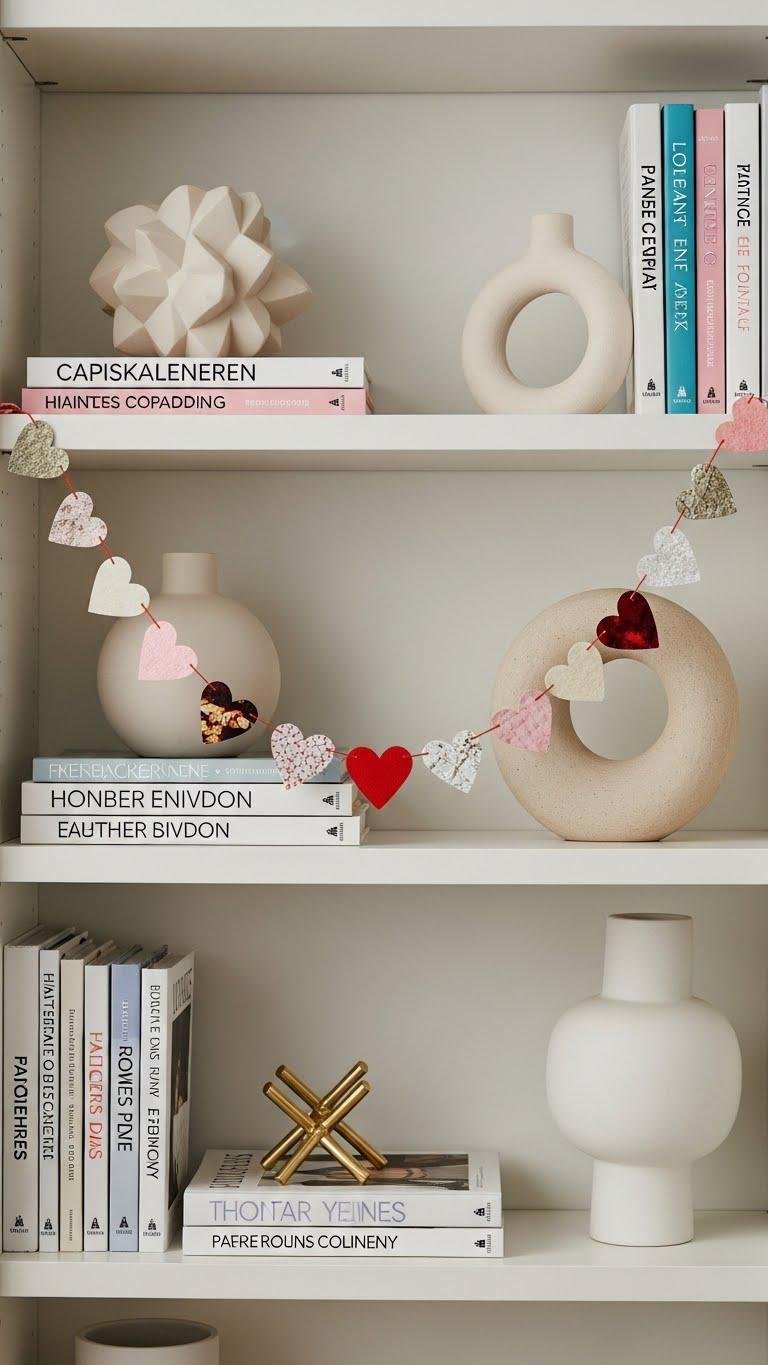 Perched along the top shelf, a heart garland instantly sharpens your mantel or bookcase into a Valentine focal point—string small, mixed-media hearts (paper, felt, metallic) at varying intervals for texture and movement.