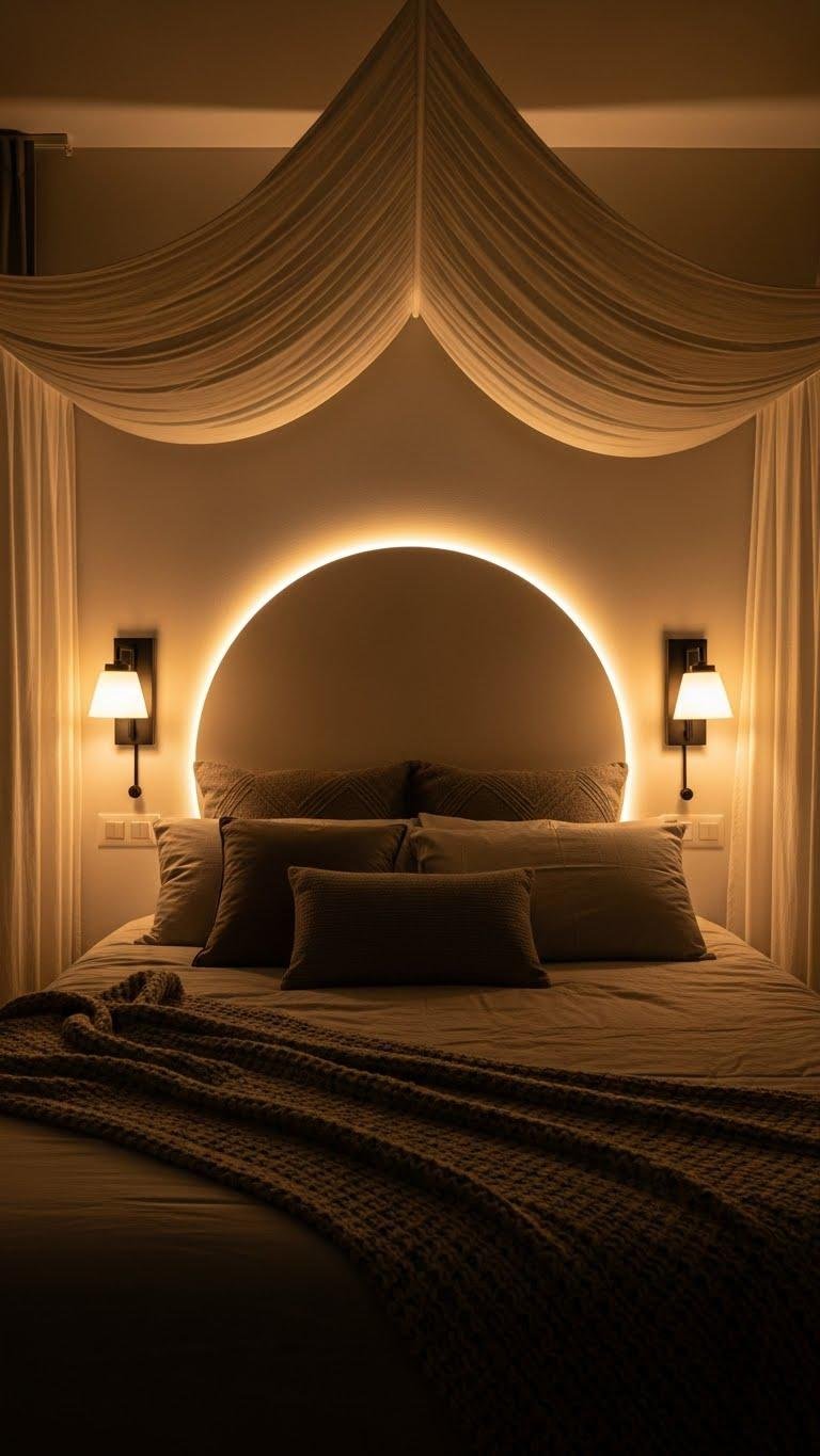 After soft textiles set the mood, dim headboard lighting seals it—low, warm LEDs or a hidden strip behind the headboard creates a halo that flatters skin tones and softens the room.