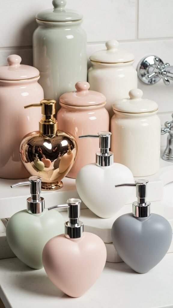 Choose a vintage pump look or matte modern hearts, mix ceramic jars in varied heights, and keep tones soft—blush, cream, muted gold. You’ll create a liberated, chic vignette that feels curated, playful, and effortlessly spa-like.