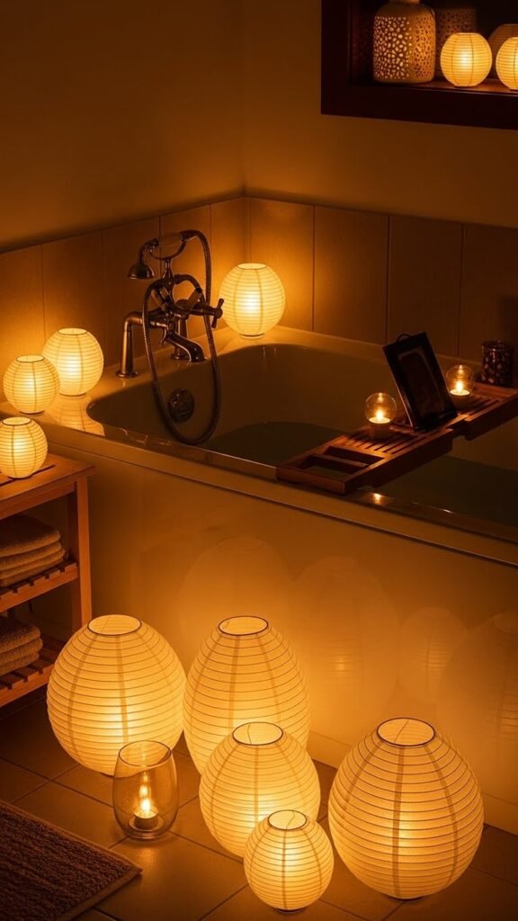After you’ve set the water to a comfy 100°F and settled in, soften the room with glowing lanterns placed around the tub’s perimeter and on nearby shelves. You’ll light paper lanterns with warm amber bulbs to cast a gentle, freeing glow. Arrange varied sizes for depth, keep pathways clear, and choose battery or low-heat options to stay safe while feeling effortlessly luxe.