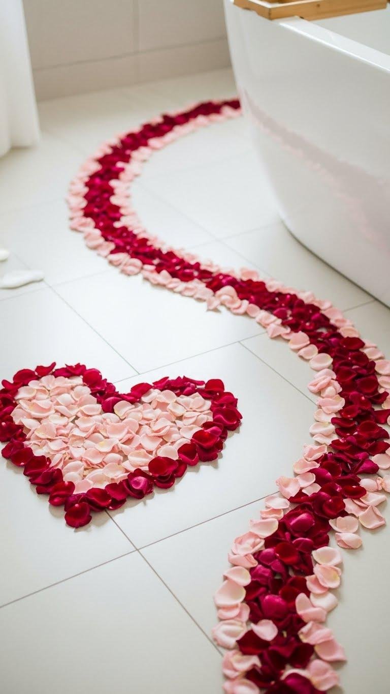 When you scatter petals in a soft heart or lay a crescent trail to the tub, you turn a simple bath into a deliberate, romantic moment. Arrange a minimal petal mandala on the floor or a single-file path that invites slow steps. Think rose conservatory hues — deep crimsons to blush pinks — and keep lines clean, effortless, and free-spirited.