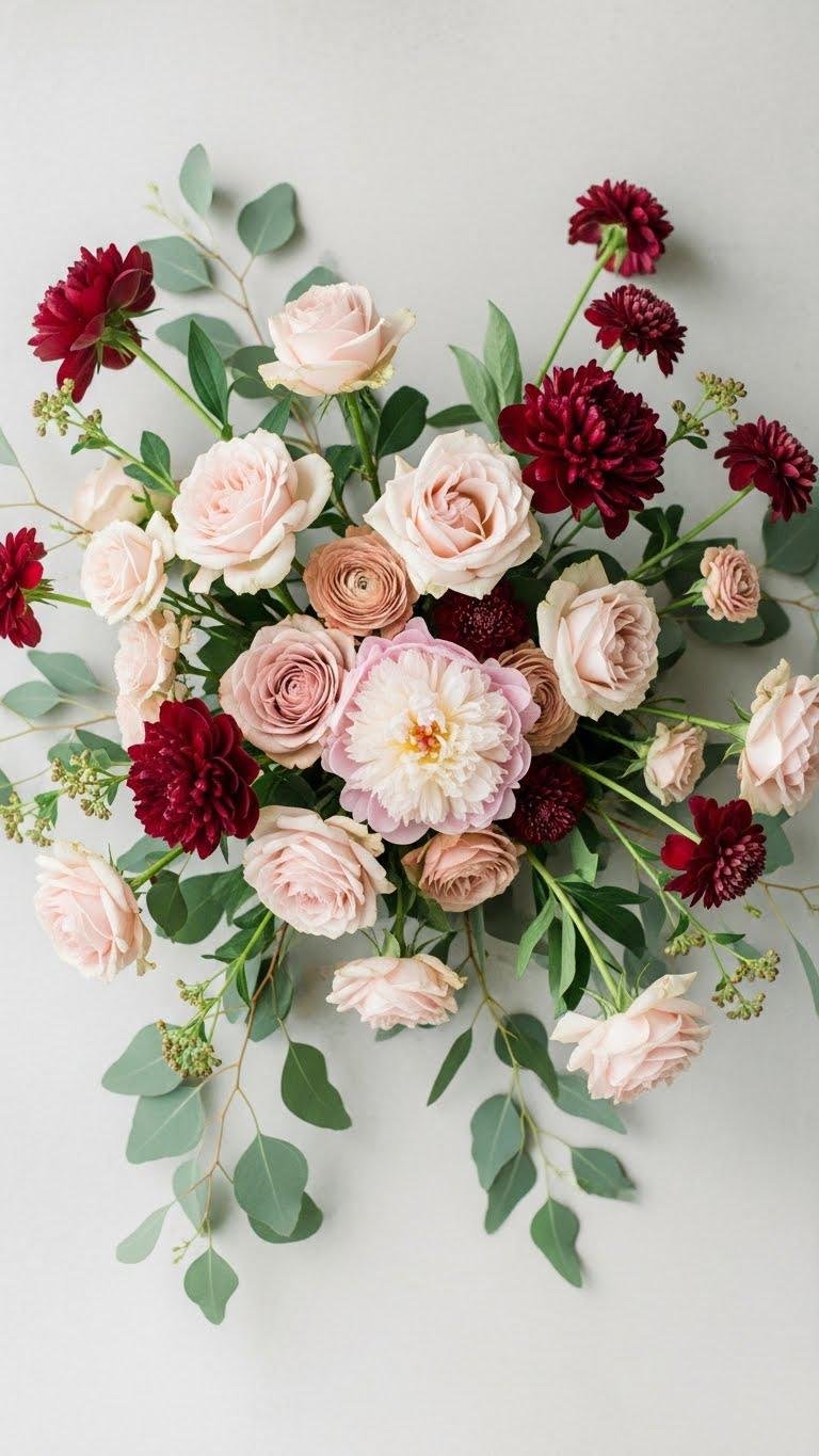 Bring in mixed petals and leafy stems to create a layered, organic look that feels current and effortless. You’ll play with petal gradients—soft blush to deep crimson—against vibrant greens so foliage contrast pops. Arrange loose clusters, let stems drape casually, and avoid perfection; the result reads modern and free. It’s an easy, spa-like statement that invites relaxed romance without feeling staged.