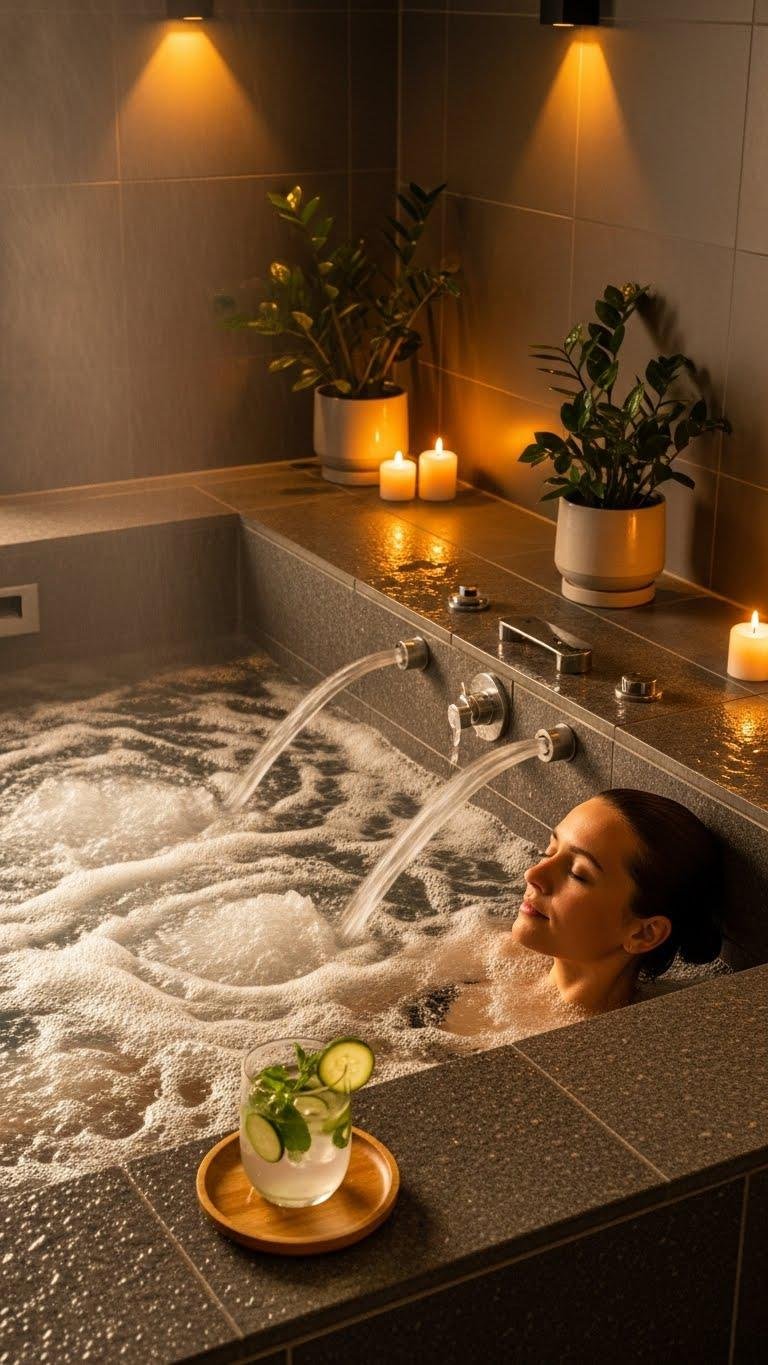 Dim lights, an ambient playlist, and flickering candles frame couples reflection, while minimalist towels, eucalyptus sprigs, and open windows let you breathe freely and stay present together.