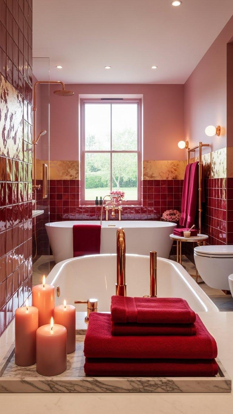 With jewel-toned reds and soft blushes layered against warm gilt accents, you’ll transform a simple bathroom into a luxe spa retreat that feels both indulgent and modern.