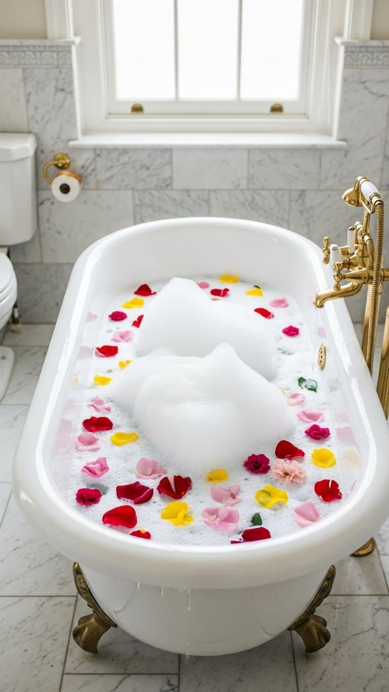 Scatter fresh petals and match them to scented bathbombs pairing for layered aroma.