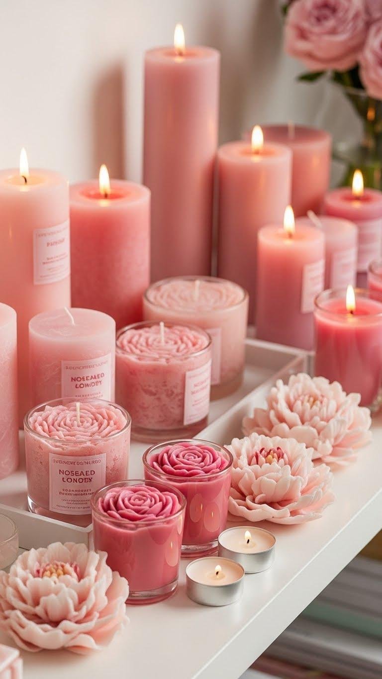 If you want instant ambiance, arrange pink-infused candles in varying heights and scents to create a warm, fragrant focal point—think blush pillars, rose-scented votives, and pale-peony tealights clustered on a tray or staggered along a shelf. You’ll balance scented wick placement for even aroma and melt, use color blocking candles for graphic pops, and keep the look modern, relaxed, and effortlessly luxe.